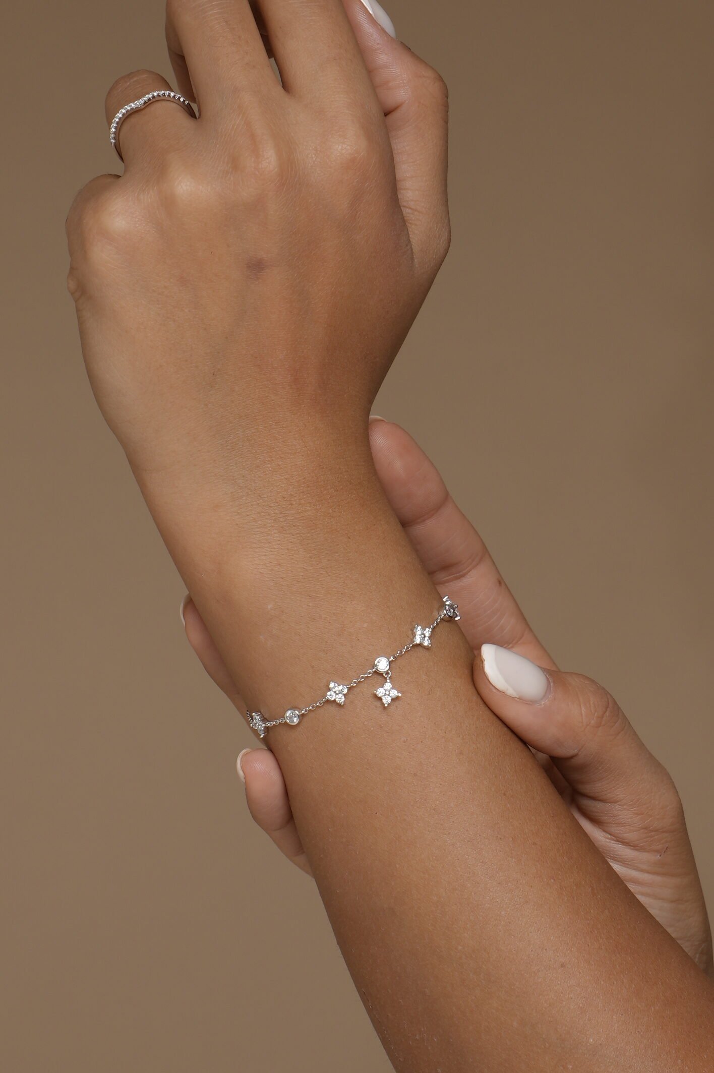 Son design raffiné associe des motifs étoilés et des zircons scintillants, qui captent la lumière à chaque mouvement, comme un ciel étoilé illuminant ton poignet. Ajustable grâce à sa chaîne d’extension, il s’adapte parfaitement et se porte aussi bien seul qu’en parure avec le collier assorti.