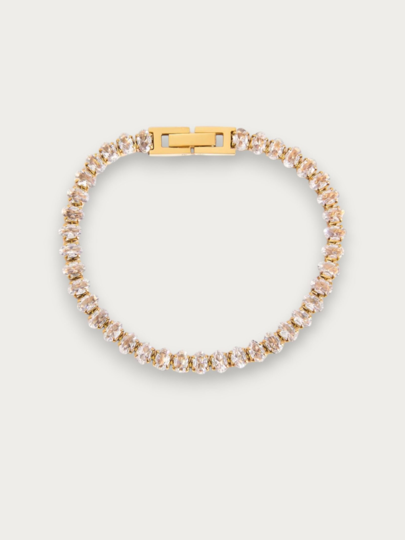 Zayna, qui signifie “beauté” en arabe, incarne l’élégance intemporelle. Son anneau plaqué or 18K, orné d’une succession de cristaux lumineux, capte chaque rayon de lumière et sublime le poignet avec raffinement.